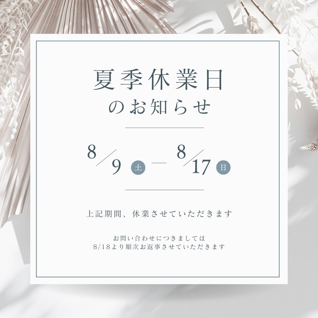 8/9~8/17まで夏季休暇のためお休みをいただきます。お問い合わせ等につきましては8/18以降順次ご連絡いたします。何卒、よろしくお願いいたします。
